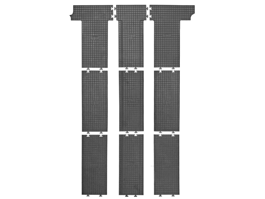 Quality rubber car mats for the VW Transporter T5 / T6, manufactured since 2003. This is a set for the whole car. The car mats have a traditional (chequered) design, which prevents water or melting snow from spilling over the mats. The edge of the car mats is approximately 1 cm high.