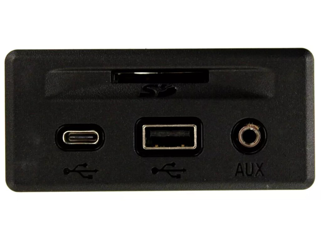 Black audio player, USB, auxiliary input and memory card connector.