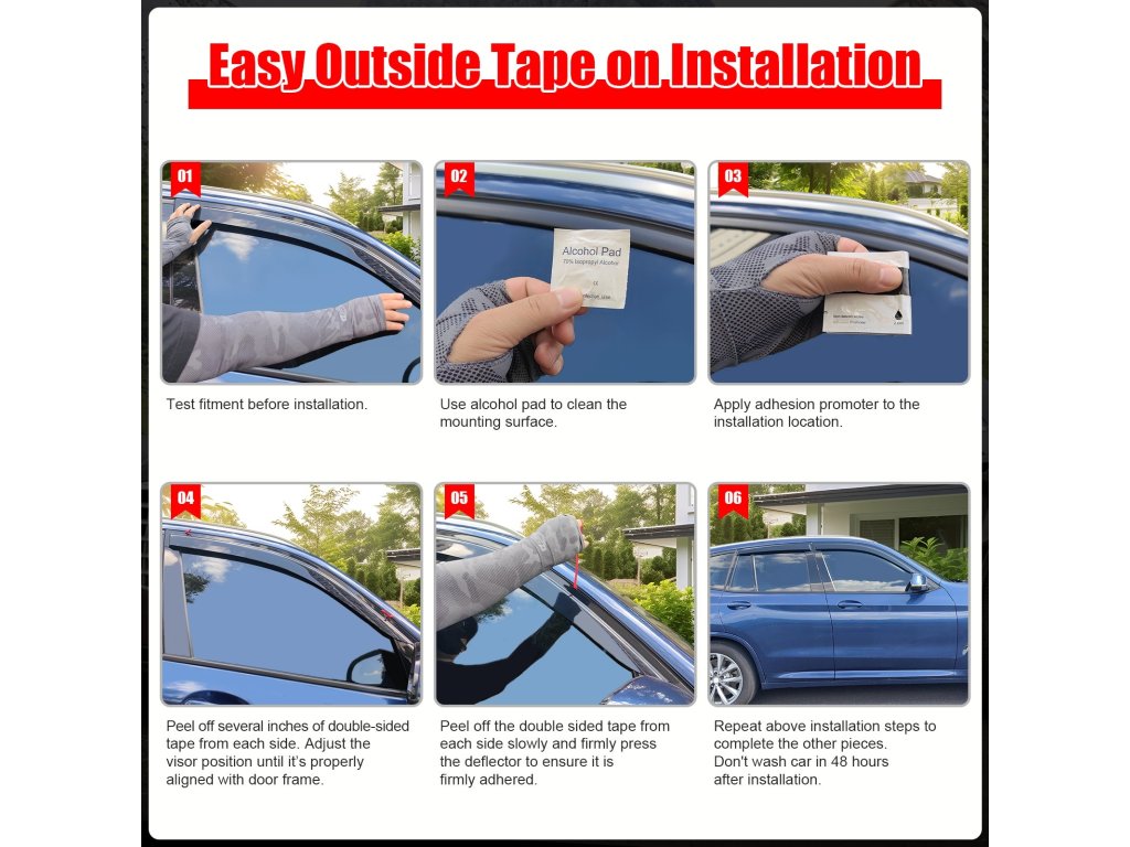 Installation: No drilling, 3M tape installation Material: Premium acrylic with UV protection Color: Smoked (smoke) Style: Slim profile