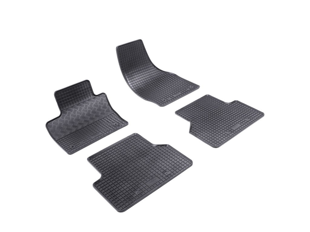 Gumowe dywaniki samochodowe o tradycyjnym kwadratowym wzorze. Krawędź ma około 1 cm wysokości.Wysokiej jakości gumowe dywaniki samochodowe do samochodu Audi A6. Dywaniki samochodowe mają tradycyjny (kratownicowy) wzór, dzięki czemu woda ani topniejący śnieg nie przelewają się po dywanikach. Krawędź dywaników samochodowych ma wysokość około 1 cm.
