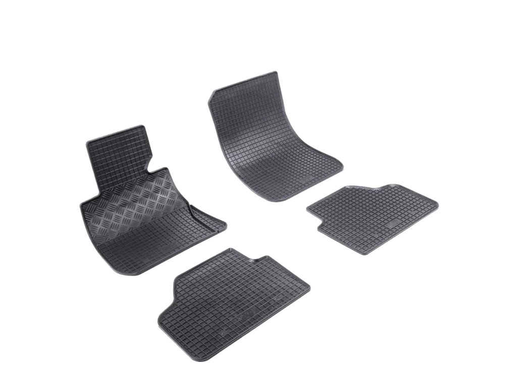 Gumowe dywaniki samochodowe o tradycyjnym kwadratowym wzorze. Krawędź ma około 1 cm wysokości.Wysokiej jakości gumowe dywaniki samochodowe do pojazdu BMW X1, produkowanego w latach 2009-2015. Dywaniki samochodowe mają tradycyjny (kratownicowy) wzór, dzięki czemu woda ani topniejący śnieg nie przelewają się po dywanikach. Krawędź dywaników samochodowych ma wysokość około 1 cm.