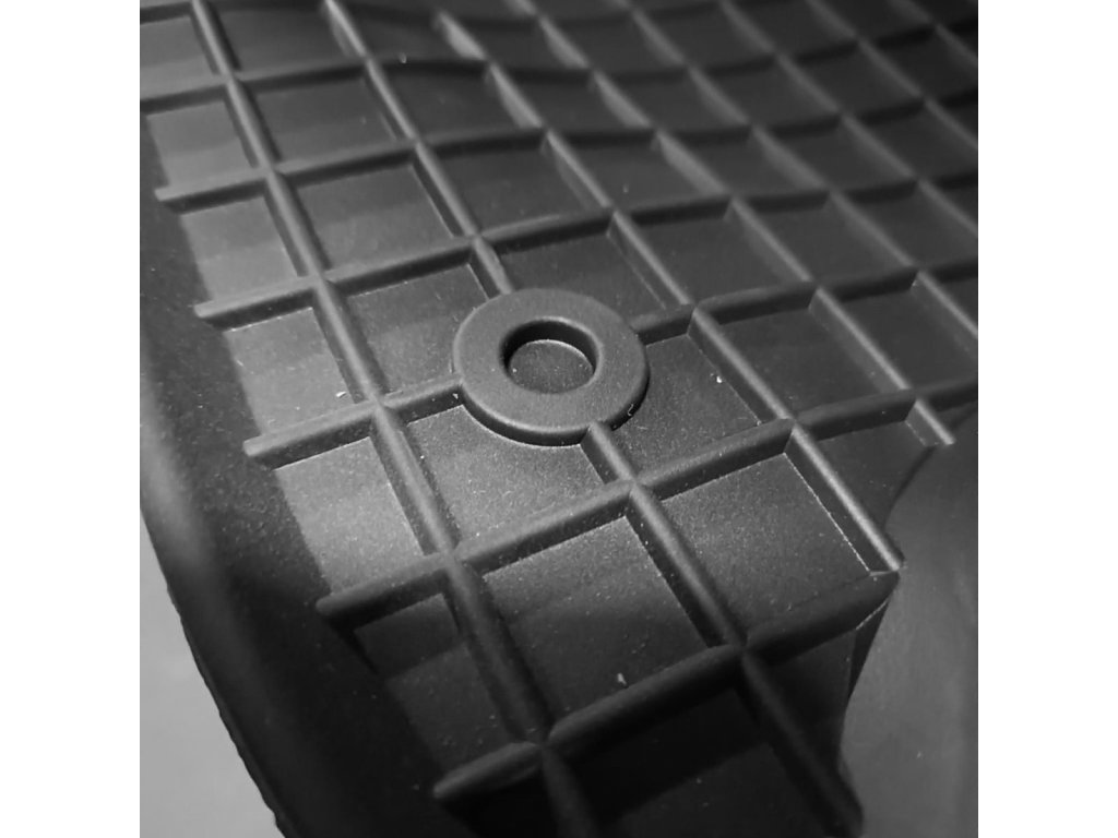 Gumowe dywaniki samochodowe o tradycyjnym kwadratowym wzorze. Krawędź ma około 1 cm wysokości.