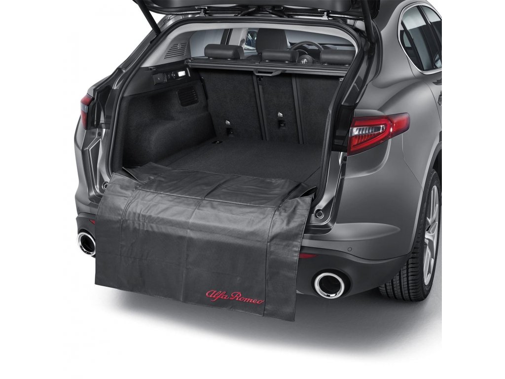 Protezione per il bagagliaio. Tappetino pieghevole rimovibile di colore nero con logo Alfa Romeo ricamato in rosso.